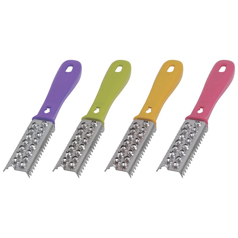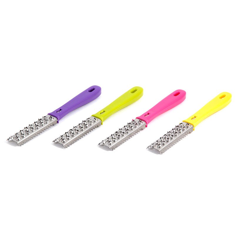Состав: (ABC, нерж. сталь) Цвет в ассортименте Размер лезвия -9 см. Упаковка: стикер Рыбочистка быстро удалит чешую, сохранит порядок на кухне и приступите к приготовлению рыбных блюд Изделие состоит из стальной рабочей поверхности и ручки с полимерным покрытием, легко моется и не впитывает запахи.