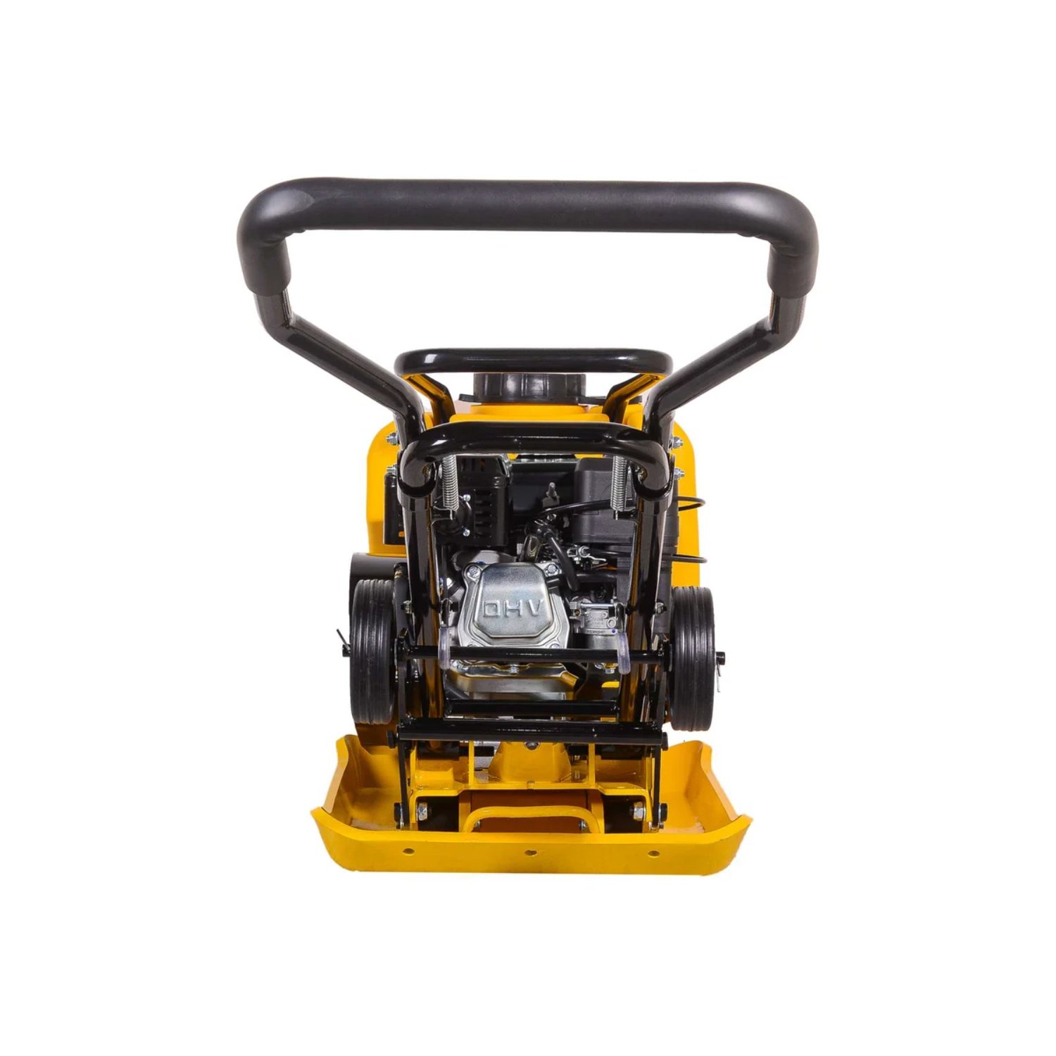Конструкция максимально продумана для комфортности эксплуатации. Устройство оснащено прочной металлической рукояткой с виброгасящей накладкой и выведенным на нее рычагом газа. Все элементы конструкции расположены в пределах доступности, металлические поверхности защищены от коррозии специальным покрытием. Наличие 2 передаточных ремней повышает надежность и увеличивает срок службы агрегата. Бензиновая виброплита оснащена виб